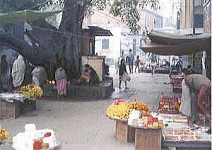 ![]() 日中、大木の根本の祠に花を ささげる人々。夜は路上生活者 が毛布にくるまって寝ていた。 (インド・ヴァラーナシ、1988年) |