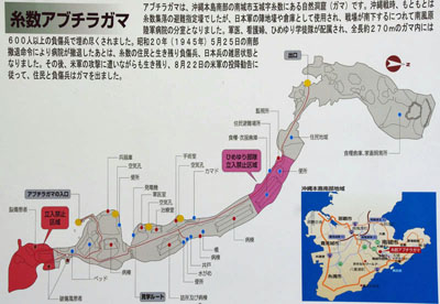 沖縄本郷南部に多数ある鍾乳洞の1つのアブチラガマ。 本土攻撃を少しでも遅らせるために徹底抗戦を命じられ た日本軍はこれら鍾乳洞に立てこもるなどしたが、爆弾 を撃ち込まれたり火炎放射器で焼かれたりしてほぼ全 滅した。しかし、アブチラガマは規模が大きかったこと等 により、日本軍が最南部に逃げた後、残っていた重症の 傷病兵や住民が生きながらえ、敗戦後に投降した。戦後 にゴミ捨て場等になっていたものを住民や市民団体が掘 り起こし、予約制で見学できるようにした。図の赤紫部分 は朝鮮人慰安婦がいた場所で、ひめゆり部隊は立ち入り 禁止となっていた。 |