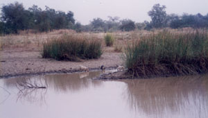 ![]() まだ深みに水のたまっている 乾季の始まりの川に 水を飲みに来た豚の親子(中央)。 しかし、住民も同じ水を飲む。 (ブルキナファソ、1996年) |