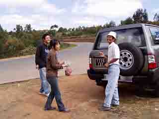 長谷川さんが迎えに来てくれるという国道端の店で、「1つ」と言ったつもりで1,000アリアリ札(約60円)を出したら1,000アリアリ分のたくさんのパンが出てきてしまった。それをみんなに配って回る。バスを待っている人にまで配っても余った分は、長谷川さんがいつも食事をさせてもらっている家に行って芋(タピオカ)をごちそうになった際にお土産にした。 |