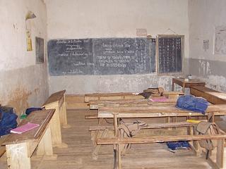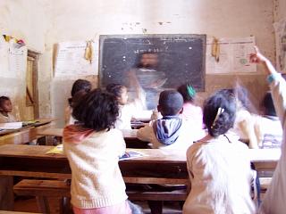 | 授業風景。みんな熱心。5年間で3回進級試験があり、落第して長く小学生をやっている子供も入るとのこと。 先生は、時々、ムチで机をバシッとたたく。 公立小学校と言っても、校長先生以外は公務員ではなく、村の人たちがお金を出し合って謝礼を払っているのが実情とのこと。 |