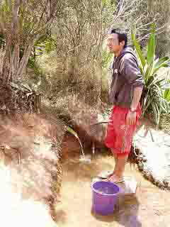 水場に水を汲みに来た長谷川さん。少し濁っている。耕作期には、耕地に優先的に配分されるため、水場の場所が遠くなってしまうとのこと。 |
