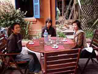 JICAマダガスカル事務所の浦田あゆみ企画調査員と、ホテル・サカマンガの中庭でのビュッフェの昼食。 |