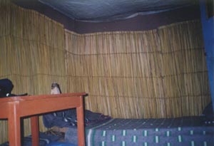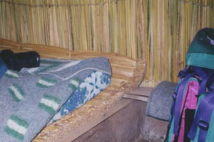 ![]() 民泊の部屋のベッド。壁土の上にも水草のマットが 張られ、ベッドにも水草のマットが敷かれていた。 The walls were covered with grass mats. And the bed was also covered with a grass mat. |