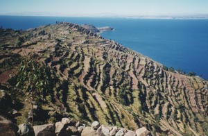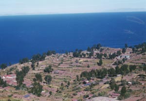 ![]() Taquile島は、ほぼ全域で段々畑がよく開発されている。 前記のとおり、家々はそのような丘の上部にある。 The Isla Taquile is well cultivated on a bit steep slopes. People live near the top of the hills. |