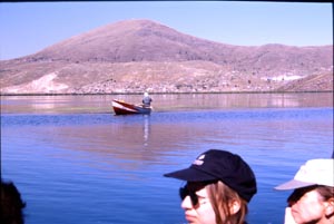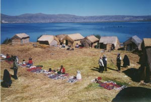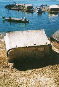 ![]() Urosの人たちは、イグサに似た水草(しばしば「アシ」 と言われるが、イグサに近いと思われる。)で浮き島を 作って暮らしている。観光客の入島料やみやげ物 の購入は重要な現金収入になっているものと 思われる。Taquile島に行く船はここに立ち寄る。 Uros people make floating islands with grass to live. Entrance fee to the islands and sale of souvenirs seem to be important cash income for them. The boat to Taquile stops at one of such floating islands on the way. |