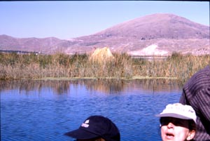 ![]() Urosの島の人には、丸太を組んだ展望台 が作ってあった。家も水草のマットで できている。船も浮き島と同じ水草で 作ってあり、有料で観光客を乗せる。 A wooden observatory in this island allowed tourists have a such a view. Here the houses are made of water grass mats. Boats which tourists can ride with some charge are also made of the grass. |