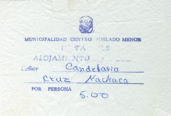 ![]() 宿泊料領収書。集落入り口には民泊受付所があり、 その日の当番の家が割り当てられる。 Receipt of the accommodation fee. Accommodation is provided by private villagers. At the entrance to the village is a tourism office where specific accommodation is assigned. |