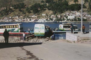 ![]() Tiquinaでチチカカ湖の渡し船に乗るバス The buses on ferry boats at Tiquina to cross Lake Titicaca |
