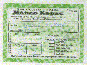 ![]() Huarinaで乗り換えてソラタへに行くための コパカバーナ発ラパス行バスの切符 Bus ticket to go to Sorata taking a bus for Bolivia first for transfer at Huarina |