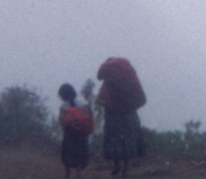 ![]() サン・ペドロに向かう途中ですれ違ったソラタ方向に歩く 母親と女の子。母親は伝統的風呂敷包みを背負い、 女の子も、小さめの風呂敷包みを背負っていた。 しかし、女の子は裸足だった(右に拡大部分)。 Mother and her girl who were walking in the directikon of Sorata. On the back of the mother was a traditional pack. On the back of the girl was a small pack which was similar to a traditional regular one. But the girl was in bare feet. |