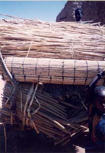 ![]() ミレット(より乾燥した地域で栽培される"petit millet") の茎を積んだ荷車。日本のアシの茎のように 使われるのかもしれません。 A cart with straws of "petit millet" which is cultivated in more arid lands. The straws seemed to be used as we use reed straws in Japan. |
