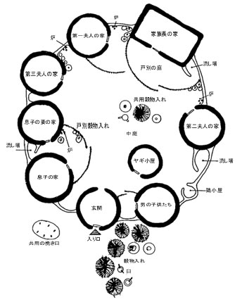 ![]() 一家族の家の例 Plan of a typical familiy unit. (Issiaka Isaac Drabo, 1993: Influence des Styles de l’Habitat Traditionnel Burkinabe sur l'Urbanisme Moderne de Ouagadougou, in Association <Decouvertes du Burkina> (ed.), 1992: Decouvertes du Burkina Tome II, Sepia-A.D.D.B., Paris and Ouagadougou)) |