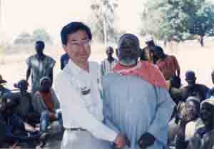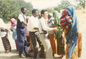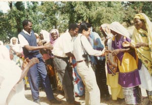 ![]() 賓客は、現地の習慣に則り、このような飲み物で歓迎 されます。中央は、UNDPブルキナファソ事務所で環境他を 担当のコンゴさん。その右は、UNDPの資金を使って 深井戸掘りや計算・読み書きなどの援助をした現地の NGOの代表。 The guests are treated with this unknown refreshment according to hte local customs. In the center is Mme Congo, UNCP officer in charge of the environment at its Burkina Faso Office. In her right is the Representative of the local NGO who provided assistance for the villagers in constructing a deep well, education for calculaiton and literacy etc. with a fund of the UNDP. |