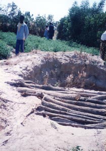 ![]() 深井戸の水を使った野菜栽培。野菜の回りに穴を掘って 水が蒸発などで失われる量を抑制。 Production of vegetables with the water from the deep well. The vegetable are planted in holes to minimize the evapration of the water. |