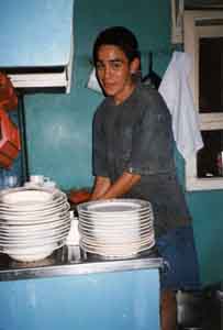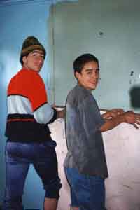 ![]() 家の改造を行うベラ家の息子と使用人のペドロ。 チリの家には使用人がいることが多い。カストロで泊まった 家では、若い女の子を使っていた。元気のないその子は、 薄汚れた服を着ていて、翌早朝も、全く同じ薄汚れた 服を着て働いていた。これに対し、ベラ家では、 使用人のペドロは元気で、クリスマスで帰っていた 大学生の息子も、ペドロと一緒に働いていた。 The son and Pedro, servant of the Vera family. Many families in Chile has a servant. At the family where I stayed in Castro, a young girl was working. This young girl looked disprited. She wore a bit dirty cloths. In the early morning on the following day, I saw her working in exactly the same cloths. In contrast to that, Pedro looked quite happy. And the son was working with him. |