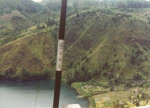 ![]() パラパトへとバスが下っていく。斜面はこのように 木が伐られ、所々に松が残るだけだった。 The bus goes down on such a steep slope to Parapat. The areas is deforested with some pine trees left behind. |