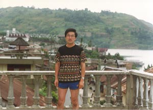 ![]() パラパトの町で買ったこの地域の柄のTシャツを着て ホテルの屋上で。(背景は、左の写真の90度左。) On the roof of my hotel in a T-shirt in a local pattern bought in the town. |