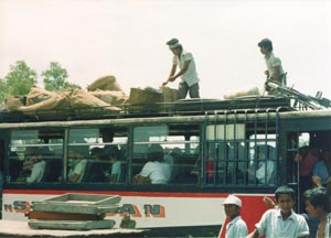 ![]() スリに遭って現金すべてをすられることとなった ブラスタギからメダン行きのバスの出発準備。 Preparation for deparuter of the bus at Brastagi to Medan in which I lost all my cash because of pick-pocket. |