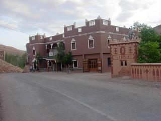 私の泊まったのは、ブマルン・ダーデスから22キロの、ちょうど道路が川を渡る橋のたもとにあるオベルジュ・デ・ゴルジュ・ダーデスAuberge des Gorges Dades(地名をとって「ホテル・アイット・ウディナールHotel Ait Oudinar」とも称する。)。外観も中もとてもきれいだが、いつでもお湯の出るバスルーム付きシングルで、朝食付100DH、朝・夕食付160DHと格安。塀で囲われた駐車場も付帯。この駐車場に特に「番人」はなく、そのため番人料も取られないが、田舎なので、番人自体、不要と思であろう。
