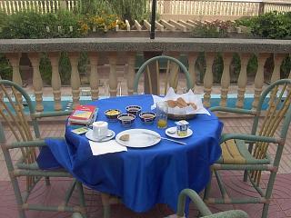 ザゴラのホテル・ドゥ・ラ・パルメレの中庭での快適でおいしい朝食 (DH 24)。 Breakfast at DH 24 in the coutyard at the Hotel de la Palmeraie in Zagora. Comfortable. |