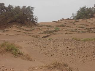 この辺りは、「砂漠」とは言っても、石や岩ばかりで(そのような場所をハマダ(hamadaまたはhammada)と言う。)、砂丘は珍しいので、こんな小さな砂山(写真右側)があるだけで、観光施設ができている。 The desert in this area is just stones and rocks (Such a area is called hamada or hammada.). Sand dunes are rare. Therefore such a small sand dune (in the right) attracts tourism facilities. |