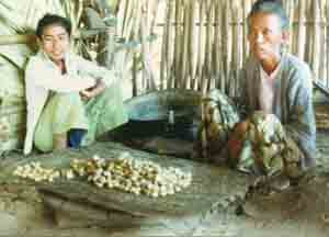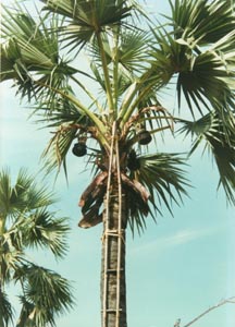 ![]() The sap from anthosteles are collected in pots. ヤシの花のつく茎(花柄)を切り、そこに壺を取りつけて樹液を集める。 |