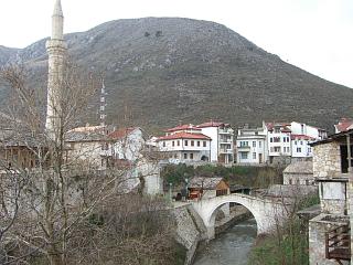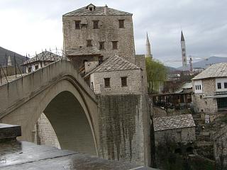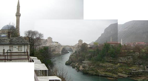 The bridge from the mosque. The buildings near the bridge have been restored. モスクから見た橋。橋の両岸付近の建物は修復されている。 |