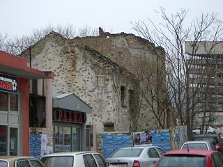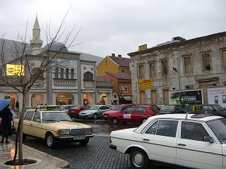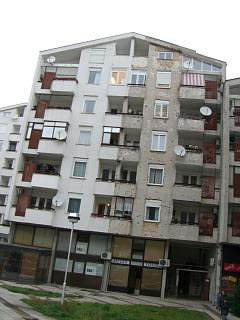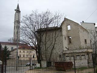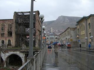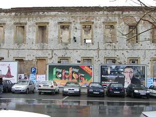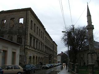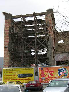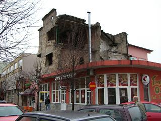 Eastern end of Musala Bridge. The central building is well decorated, but the building next to it is still left to be a remnant of the civil war. |