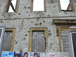 ムサラ橋の東側。正面の建物には電光掲示板も あってきれいだが、そのすぐ南の建物は内戦の 傷跡がそのままになっている。 |