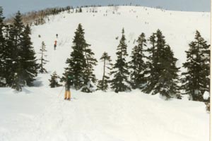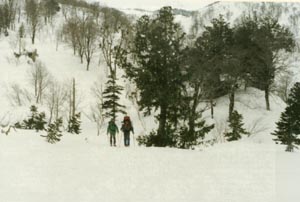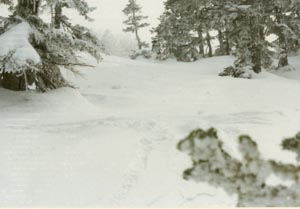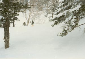 ![]() 天狗原から振子沢に入ったところ。 この降り口も、左岸側(写真右手)は 雪崩が起こることがあるので、右岸寄りを滑る。 Ascending Furiko-zawa from Tenguppara, taking the right side because of the occasional avalanche on the left slope (in the right in this photo). |