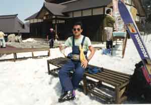 ![]() 木地屋の里の前でビール この後、温泉から予約したタクシーで白馬に戻る。 |