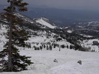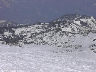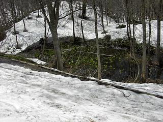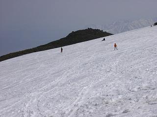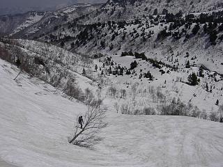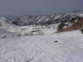 角小屋峠からウド川源流部を見る。 コースは、右寄りに降りてウド川の開口部を避け、 その先のウド側右岸の長い斜面を 斜滑降気味に降りていく。 Riverhead of Udo Gawa from Kadokoya Pass. The skiing course turns to the right to avoid the open stream of the River. After the River, the course goes down on the right slope above the River. |