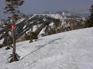 振子沢上部の蓮華温泉ツアーコース標識 天狗原から木地屋までの全線にわたって設置されている。 Marking of the Renge Onsen Skiing Course set all the way from Tenguppara to Kijiya 振子沢から左の斜面に登る部分で 見落とさないように注意。 Do not miss the one at the point where we must go out of Furikozawa to the left. |