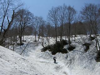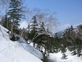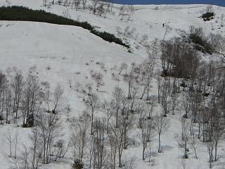 連休の谷間で、シュプールも少ない。雪質は重く、登りにはけっこうでも、滑降は容易ではない。勿論、これも自然。