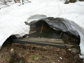 雪は層を成さず、しかし量は格別に少なくなく、おそらくその結果、全層雪崩を起こしそうな割れ目多数。スノーブリッジも、雪の量の割りに落ちるのが早い感じで、乗鞍沢のスノーブリッジが、あと何日持つかといった感じ。ワサビ沢のスノーブリッジも、いつまで持つかわからない感じだった。しかし、温泉は、仙気の湯、薬師の湯、黄金湯、内湯と、既に用意されていた全てに入る。