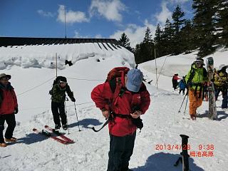 今年は、栂池ロープウェイを降りると、 安全対策の講話があり、引き続き、白馬岳・雪倉岳間で 2週間前に消息を断った登山者の御家族からの 情報提供依頼があった。 栂池ロープウェイ終点の前で身支度。 This year, as we got out of the Ropeway, we had a lecture on the safety but also a request by the familiy members one of whose members had been missing since two weeks ago in the snowy mountans betwen Mt. Hakura and Mt. Yukikura. Then we were preparing ourselves in front of the Ropeway station building. |