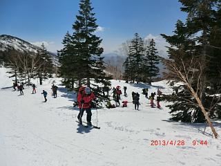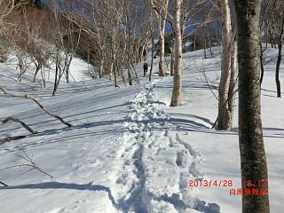 比較的若いブナ林の斜面を下る。 We were now skiing down in the beech trees. |