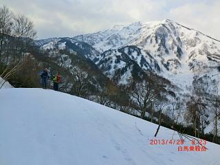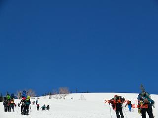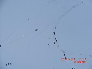 天狗原から白馬乗鞍に登るスキーヤーの群れ。 蓮華温泉に向かうスキーヤーは極めて少数で、 全くもったいないことをしている。 There were so many skiers to climb from Tenguppara to Mt. Hakuba Norikuda. However, skiers to go down to the Renge Onsen were rather rare. How do they waste their chances to enjoy the skiing to the Onsen and the bathing in snow! |