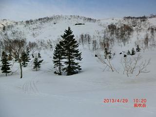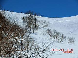 振り子沢に入り、天狗原を見上げる。 しかし、重い新雪のため、うまくターンができず、苦しむ。 カービングスキーに慣れてしまったことも影響しているだろうが、 還暦の老体に筋力の低下が最大の要因。 We had now entered into Furikozawa, leaving Tenguppara above. But the deep heavy spring snow was difficuly for me to make turns. The primary reason was my shrinking musle, although my exessive use of carving ski had also something to do. |