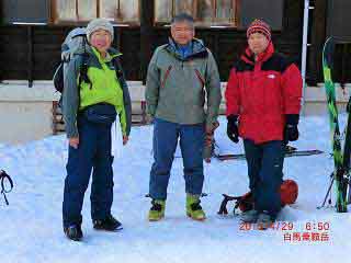 翌朝、蓮華温泉ロッジ前。 子供の野球教室のコーチをしている仲間は参加できず、 3人だけだった。 In front of the Renge Onsen Lodge next morning. Another member who had been expected to join us had to give a priority to his coaching his son's baseball team that day. |