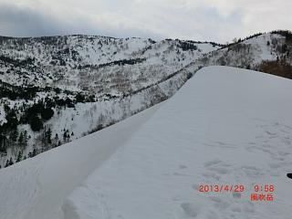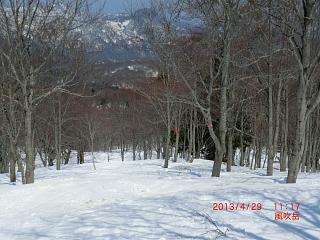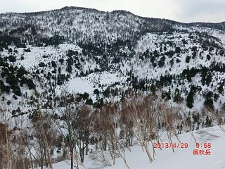 角小屋峠から風吹大池方面。風吹大池付近から 間隔の開いた木々の間を抜けて ウド川源流に向けて降りたシュプールが確認できた。 The mountain with Kazafuki O-ike from Kadokoya Pass. We saw taces of skiing from the mountain through the sparced trees. |