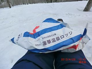 ウド川源流部からの長い斜滑降を終えて昼食。 蓮華温泉のいつものお弁当。1987年に初めて来た時から、包み紙も中身も変わっていないと思う。 蓮華温泉の一貫した姿勢がここにも現れている。 蓮華温泉の一貫した姿勢で一番重要なのは、スキーヤー、登山者の安全だが。 After the long traverse from the riverhead of Udo River, we had the luch provided by the Rege Onsen Lodge. It seemed that the package and contents had not changed since I first enjoyed the Renge Hot Spring skiing in 1987. This perhaps demonstrates the firm commitment of the Renge Onsen Lodge. But their most crucial commitment is to the safety the skiiers. |