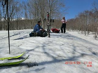 白池近くで林道に出るところで、名残を惜しんで休憩。 As we were leaving the natural slopes into the road, we took our last rest. |