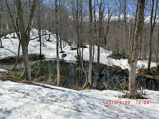 木地屋の上のミズバショウは、今年はまだ咲いていなかった。 The shunk cabbage (mizubaho) before Kijia was not yet blooming this year. |
