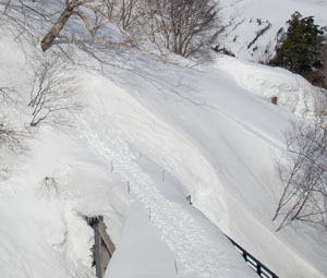 2月末の蓮華温泉関係者の下見報告に「とにかく今年は雪の量がとても多い大雪です。」とあったが、ロッジ付近の積雪は想像外の量だった。2段に雪を掘って、2階にある玄関からは入れるようにしてあった。