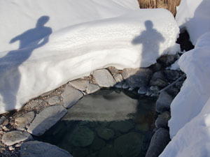 ![]() これも大雪のため、薬師の湯の温度は、外気温より も高いという程度であった。流れ込んでいるお湯の温度 は体温程度であったので、徐々に温度が上がりつつある とは思われた。 Also due to the extreme amount of snow, the temperature of Yakushi no Yu was still low, although it was definitely warmer than the air. The water flowing into the bath was as warm as human bodies, it was exptected that in some days, the bath would be as warm as human bodies. |