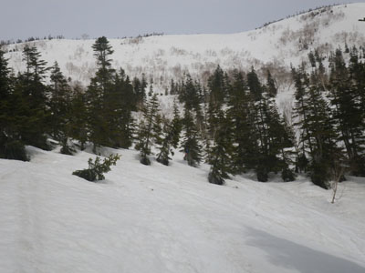 ![]() いつもなら雪に覆われている小尾根の右の大斜面。 This extensive slope in the right side of the small ridge is covered with snow usutally. |