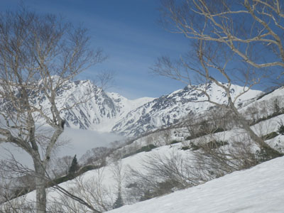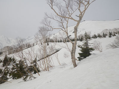 ![]() 既に木がかなり出ていた天狗原への緩斜面。 The trees were already seen above the snow. |