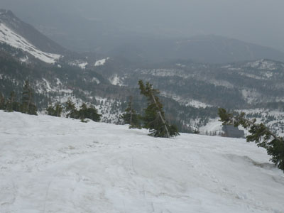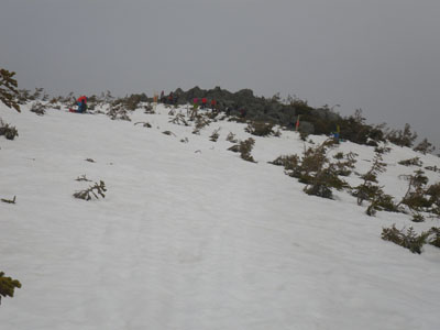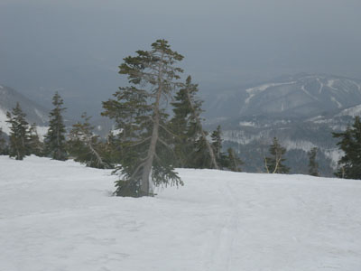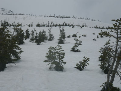 ![]() 夏道のある小尾根の最上部。いつもは上のほうだけ出ている木が 大きく出ていた。 The upper end of the small ridge which as the summer trail. Only the upper ends of the trees are exposed above snow usually. |
